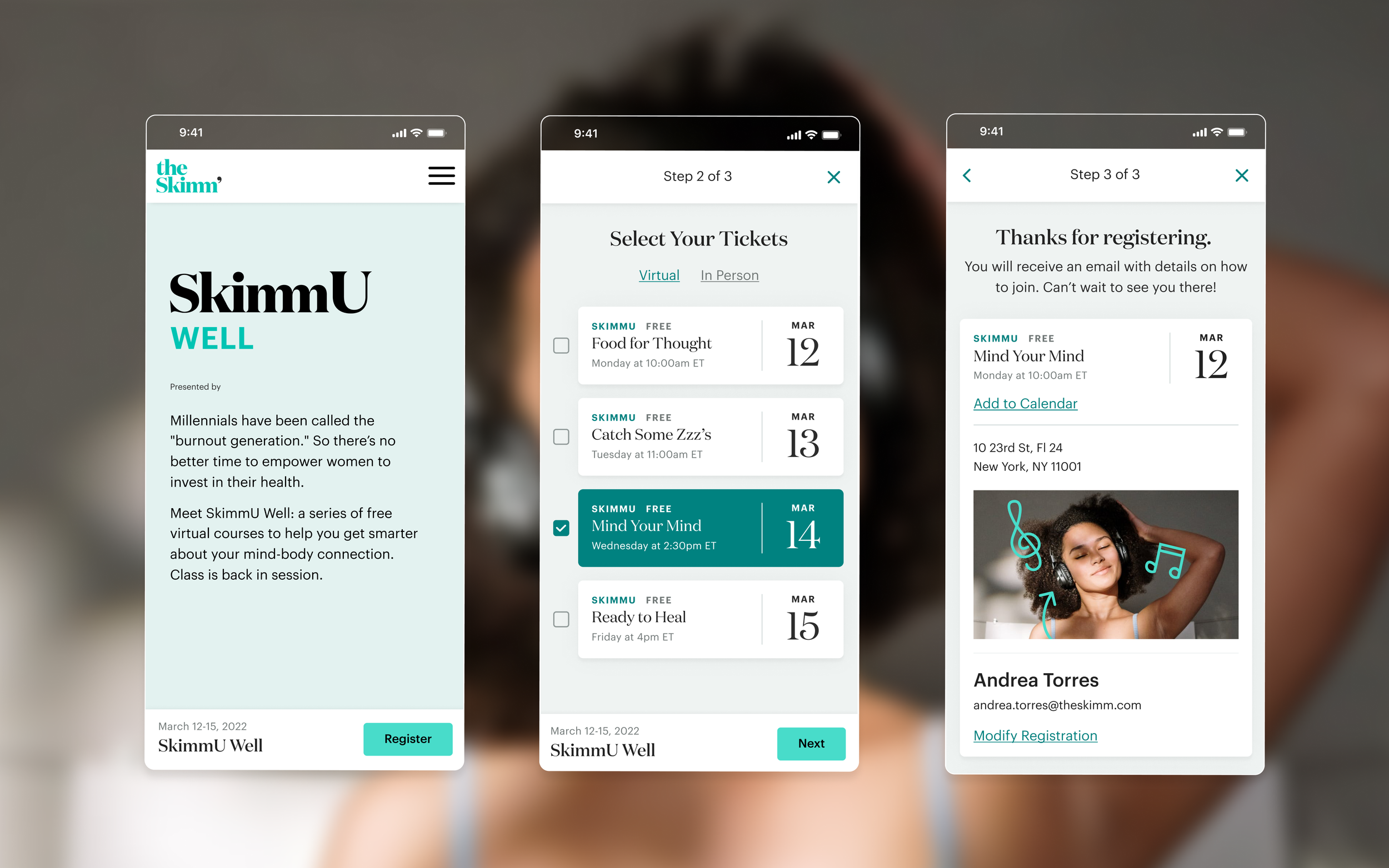 SkimmU is a multi-event series held throughout the year to support and address the mental, physical, and emotional challenges that millennial women face. What started as a few in-person events in New York led to several online and in-person week-long events. This operation needed a more robust ticketing and eventing system that could handle increased demand and simultaneously provide a seamless user experience.